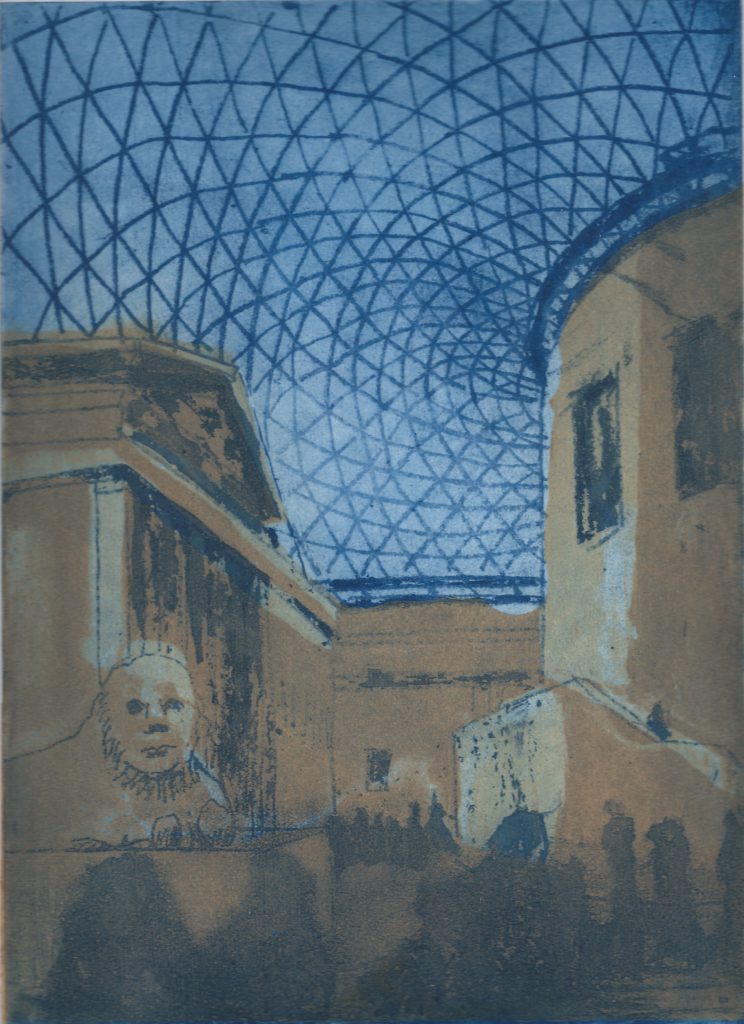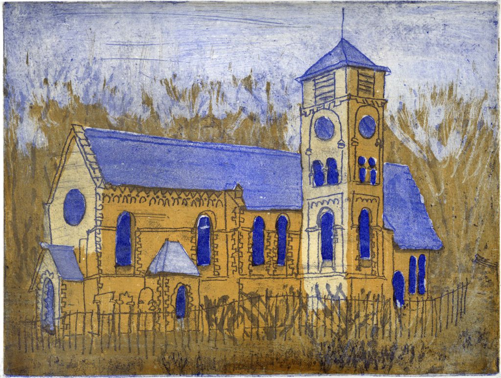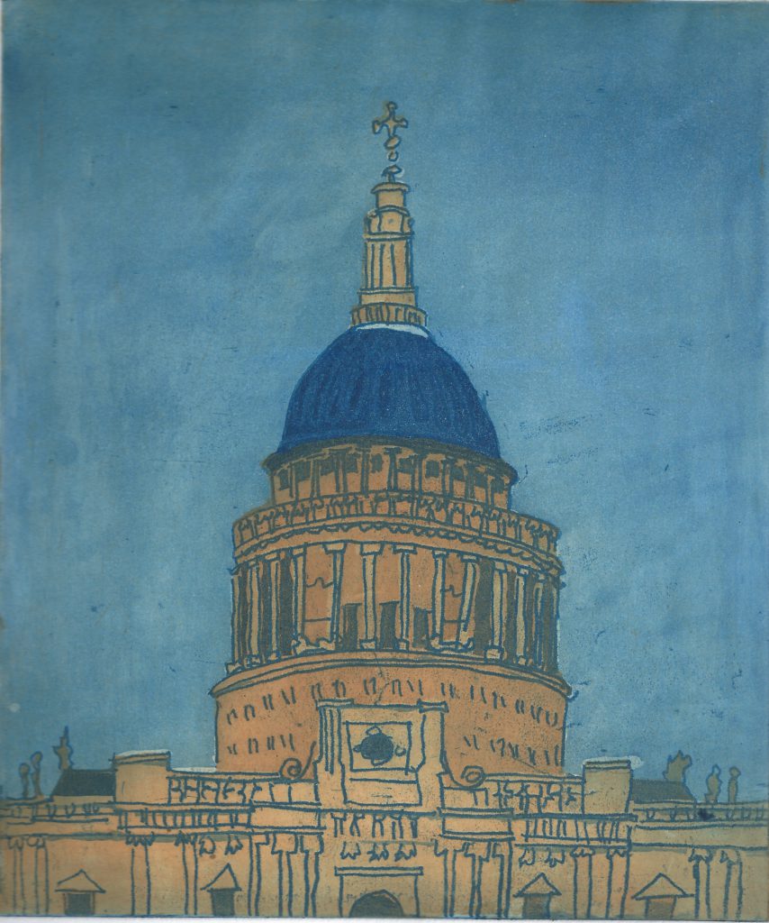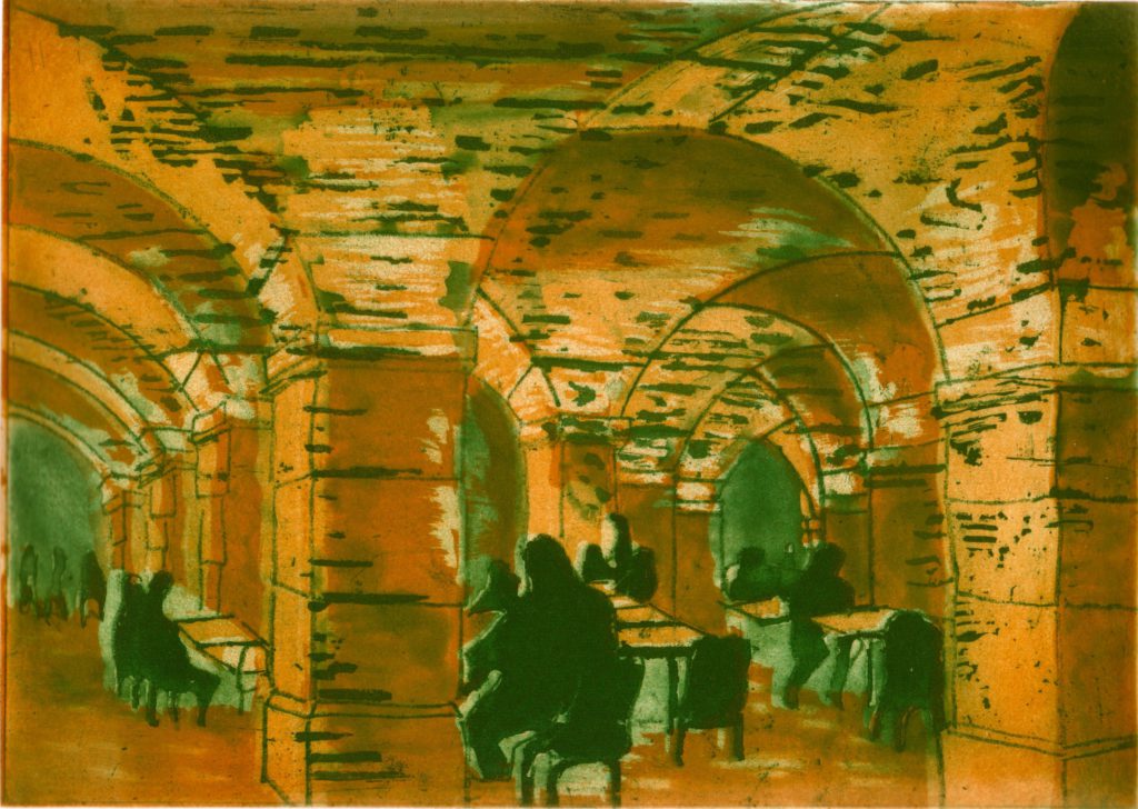 These colour prints were developed from drawings at a variety of sites in London. Many of them originated as sketches made on outings with Drawing London – a group that meets once a month to draw at different locations in London. Each of the prints below is produced from two separate plates, by means of etching and aquatint. Each plate is inked up with a separate colour : the two colours can mix to provide a variety of different colours.