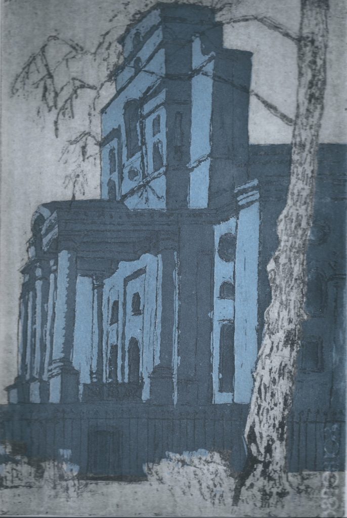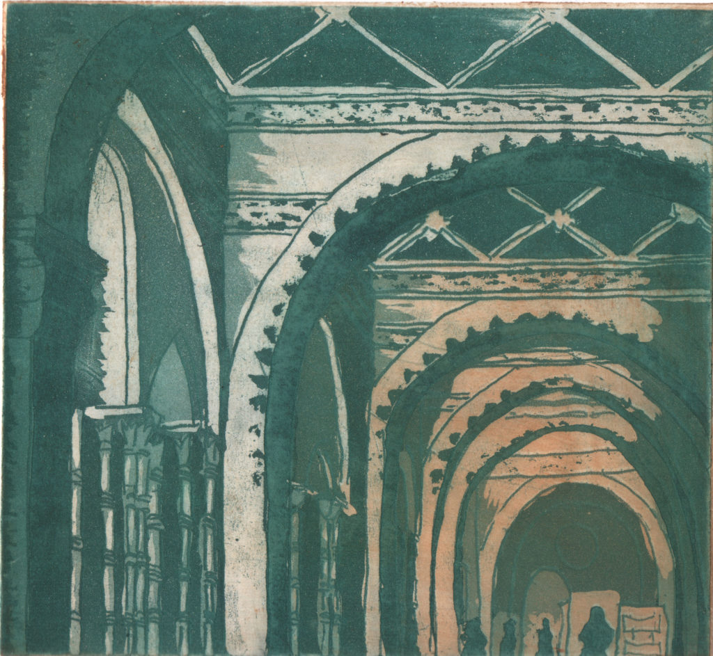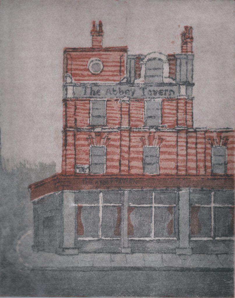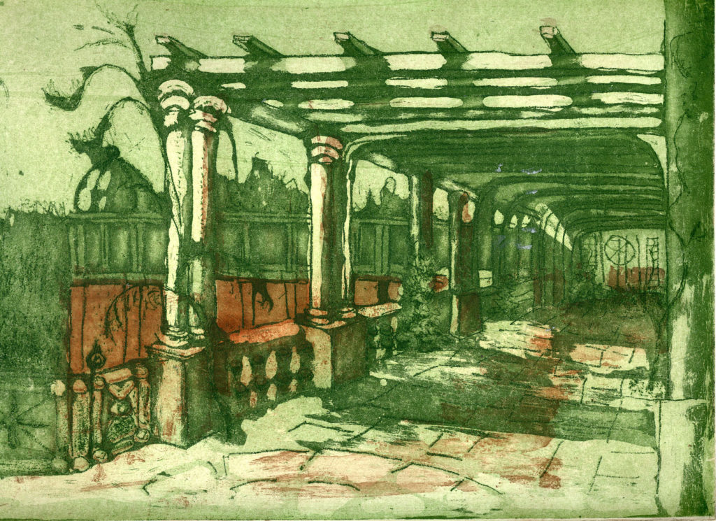 These colour prints were developed from drawings at a variety of sites in London. Many of them originated as sketches made on outings with Drawing London – a group that meets once a month to draw at different locations in London. Each of the prints below is produced from two separate plates, by means of etching and aquatint. Each plate is inked up with a separate colour : the two colours can mix to provide a variety of different colours.
