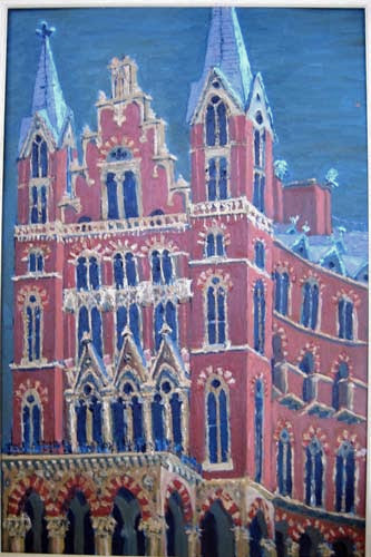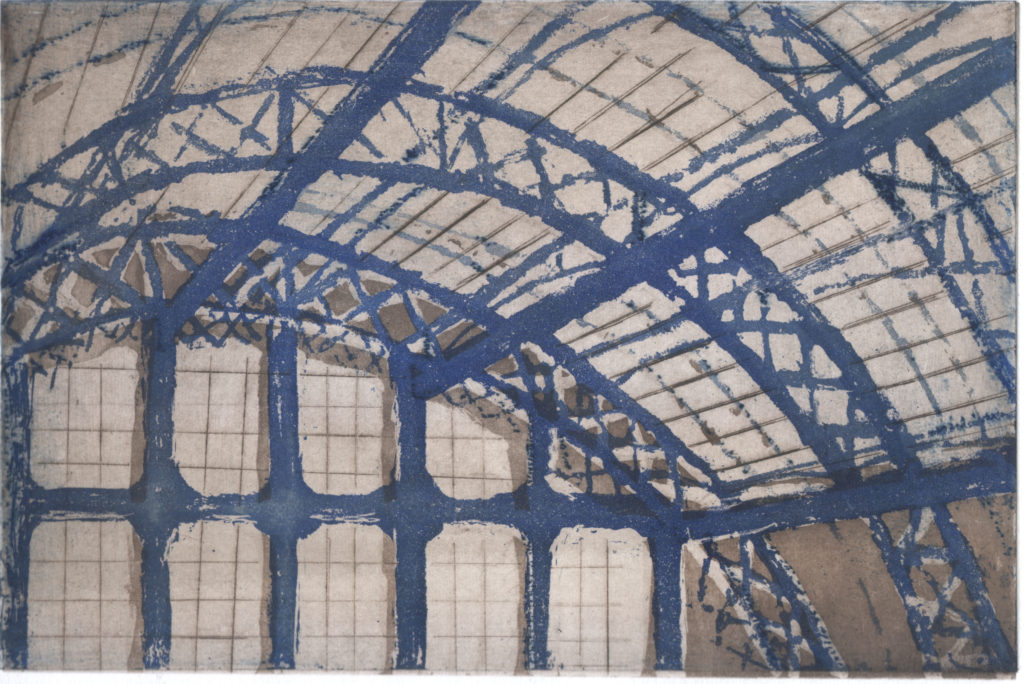 I am fascinated by St Pancras station and should revisit it soon. The first two prints were made in 2016; the print of the gateway and the view from Midland Road in 2012. The three interior prints were made soon after the building was renovated to become St Pancras International. I made the other three prints and the two paintings much earlier. Each of the prints is made from two plates inked up in different colours.